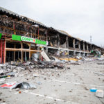 Keine 500 Meter weiter befand sich an der Grenze zur Stadt Butscha. Trotz der zuvor gesehenen Zerstörung bot sich hier ein noch schlimmeres Bild, als in den anderen Orten. Die Schwere der Schäden schien sich noch mehr gesteigert zu haben. Die „Giraffe Mall“, einst ein modernes Einkaufszentrum, war völlig demoliert, hier muss es massive Angriffe gegeben haben. Ein Mörsergeschoss steckte noch in einem Bordstein fest, wir nicht explodiert und musste noch entschärft werden. Neben einem ausgebrannten und unglaublich deformierten Autowrack lag noch eine Leiche. Augenscheinlich ein Zivilist, auf dem Bauch liegend mit verkohlten Beinen. Daneben Wohnhäuser und Gärten, alles davon aber kaputt und in Schutt und Asche gelegt.