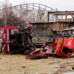 Direkt hinter Butscha befindet sich der Ort Hostomel, wo auch der bekannte Antonov-Flugplatz ist. Hier stand auch das bekannte größte Flugzeug der Welt, welches bei den Angriffen zerstört wurde. Vor dem Eingang Flugplatz war bereits große Zerstörung durch Raketen und Artillerie zu sehen. Mehrstöckige Wohnhäuser wurden offenbar von Raketen getroffen, riesige Löcher klafften in den Hauswänden. Überall lagen zerstörte Autowracks herum, vereinzelt steckten auch Blindgänger im Boden. Ukrainische Militärtransporter brachten russische Fahrzeugwracks aus dem Flugplatz heraus, schleppten auch einige erhaltene Fahrzeuge ab. Hinter dem Flugplatz befand sich ein Kraftstoffdepot, dieses wurde offenbar ebenfalls gezielt angegriffen und zerstört. An mehreren Stellen brannte es noch, die Flammen wüteten offenbar schon eine sehr lange Zeit. Direkt daneben befanden sich Einsatzfahrzeuge der Feuerwehr. Ein Tanklöschfahrzeug war augenscheinlich direkt von einem Geschoss getroffen worden. Es wurde in mehrere Teile gerissen und stürzte um. Und auch hier entdeckte man überall noch Blindgänger, die erst noch entschärft werden mussten.